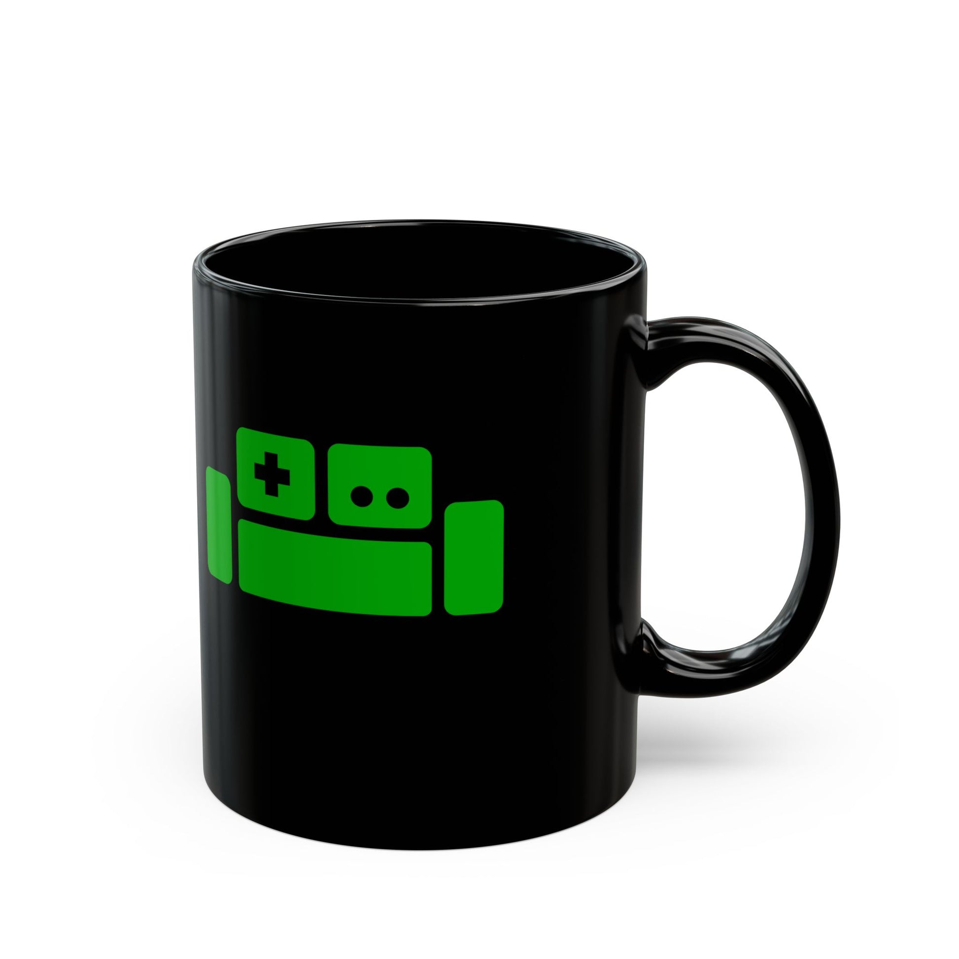 It's the Basement Logo Mug - in a typical coffee mug size. With a green Basement couch logo on it!
