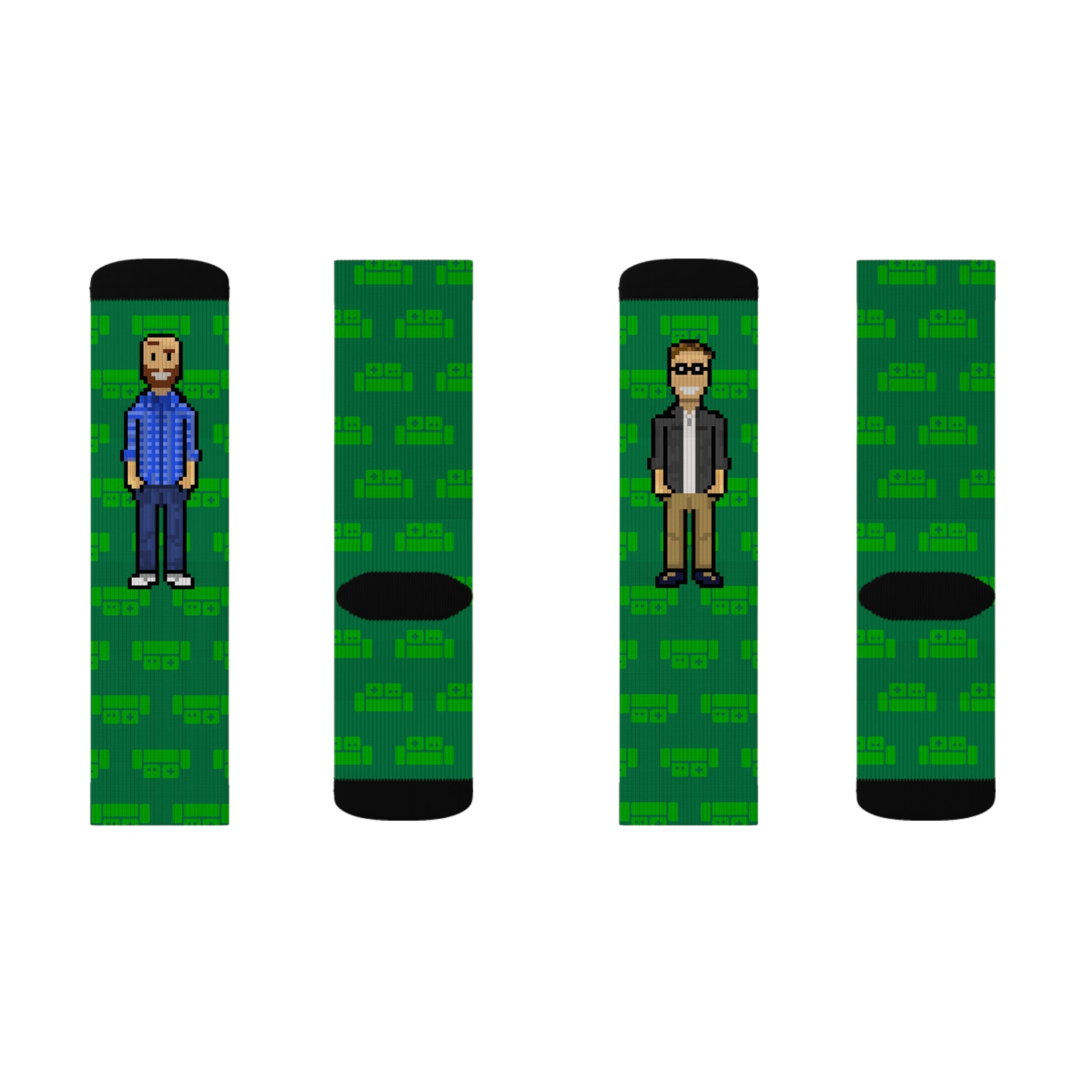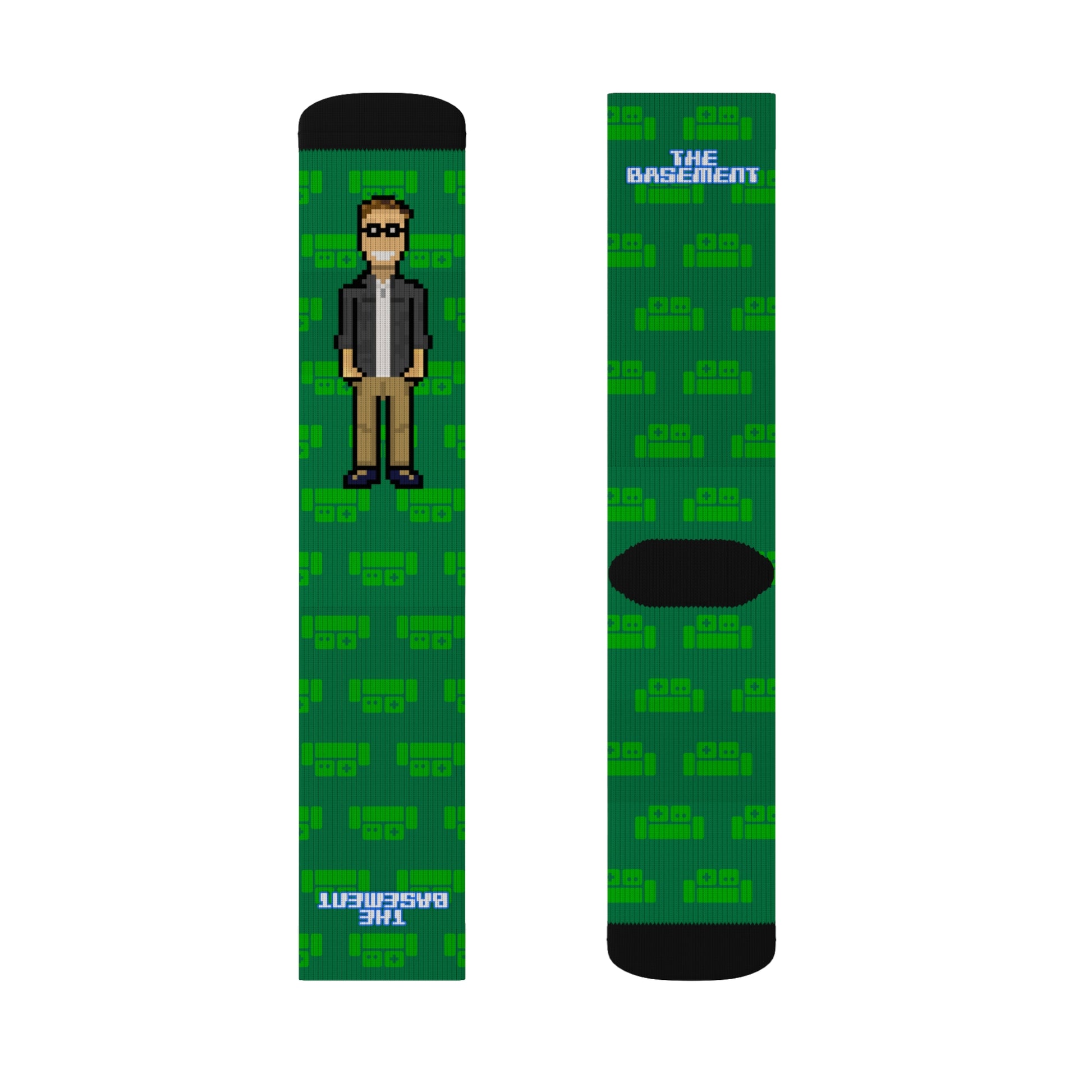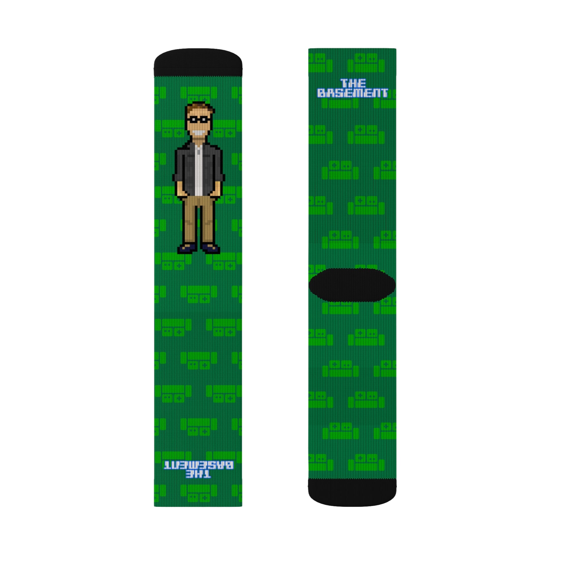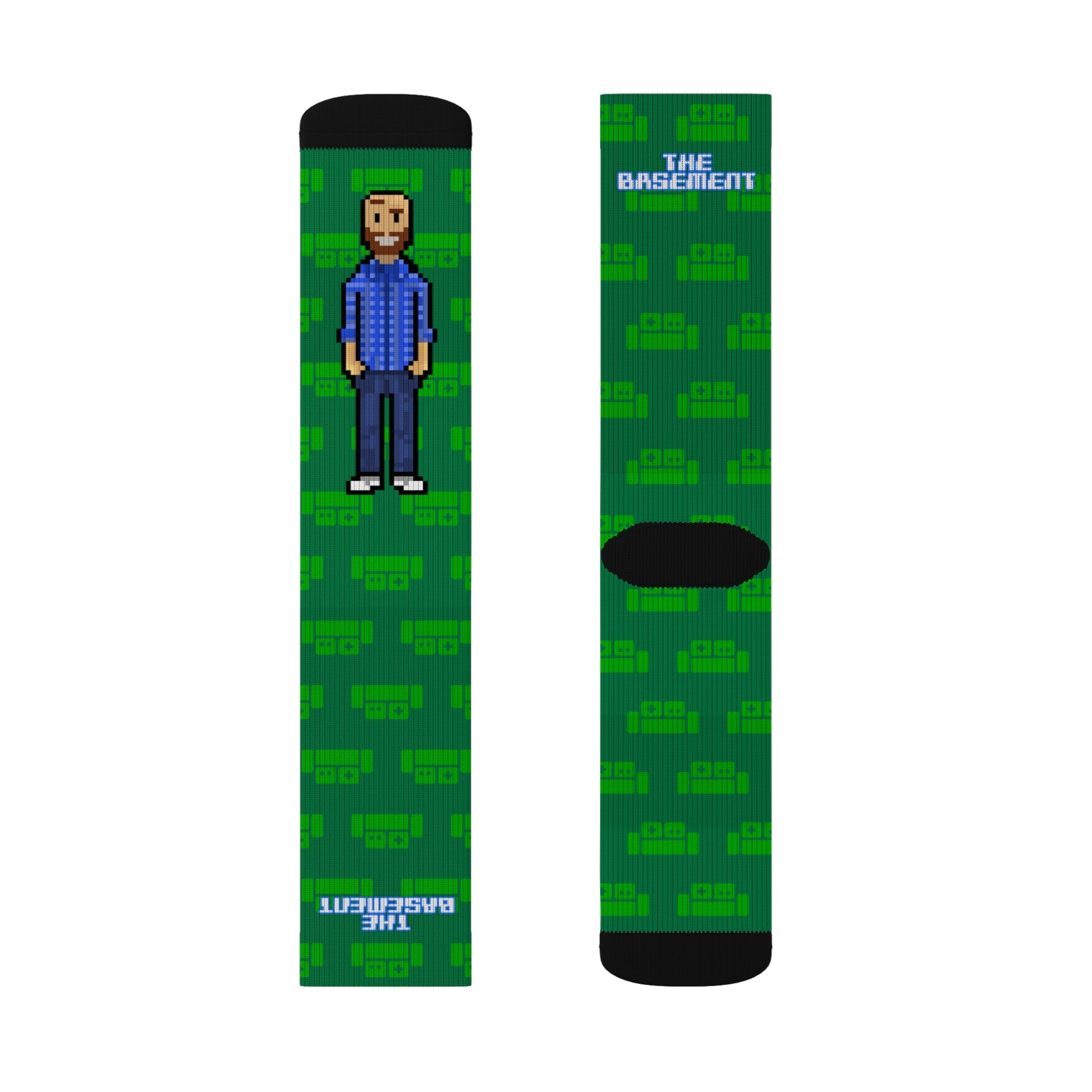 These sublimation socks feature a cozy fleece lining and an all-over print design of Ted and Peter from The Basement on Youtube. Perfect for lounging, movie nights, or gaming sessions. Ideal for fans of The Basement on Youtube.