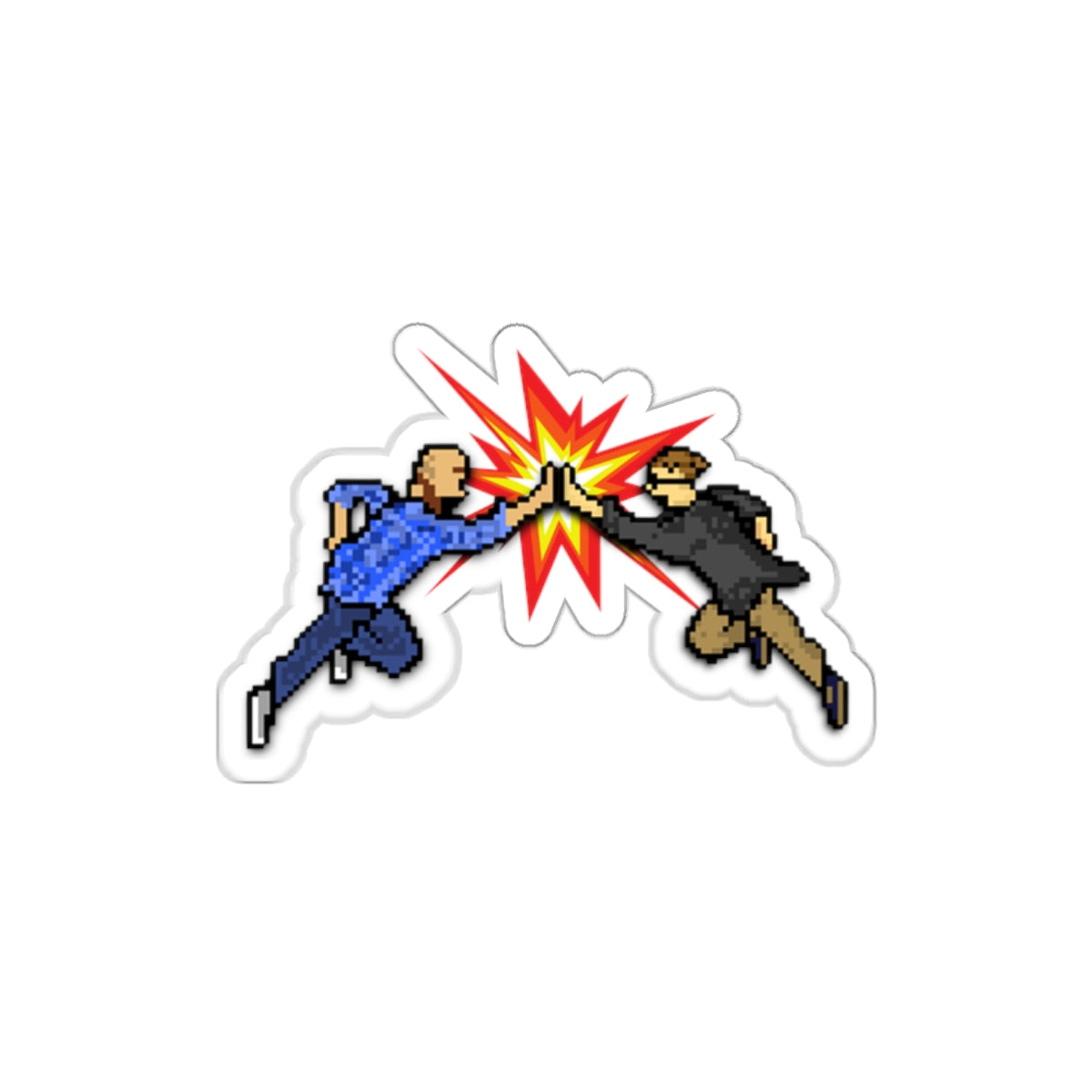 Vibrant die-cut stickers of the Youtube Channel: The Basement, featuring an explosive hi-five. Perfect for fans of the channel to decorate laptops, notebooks, water bottles, or any smooth surface. Ideal for adding a fun and unique touch to your belongings. Great for gift-giving on birthdays or holidays.