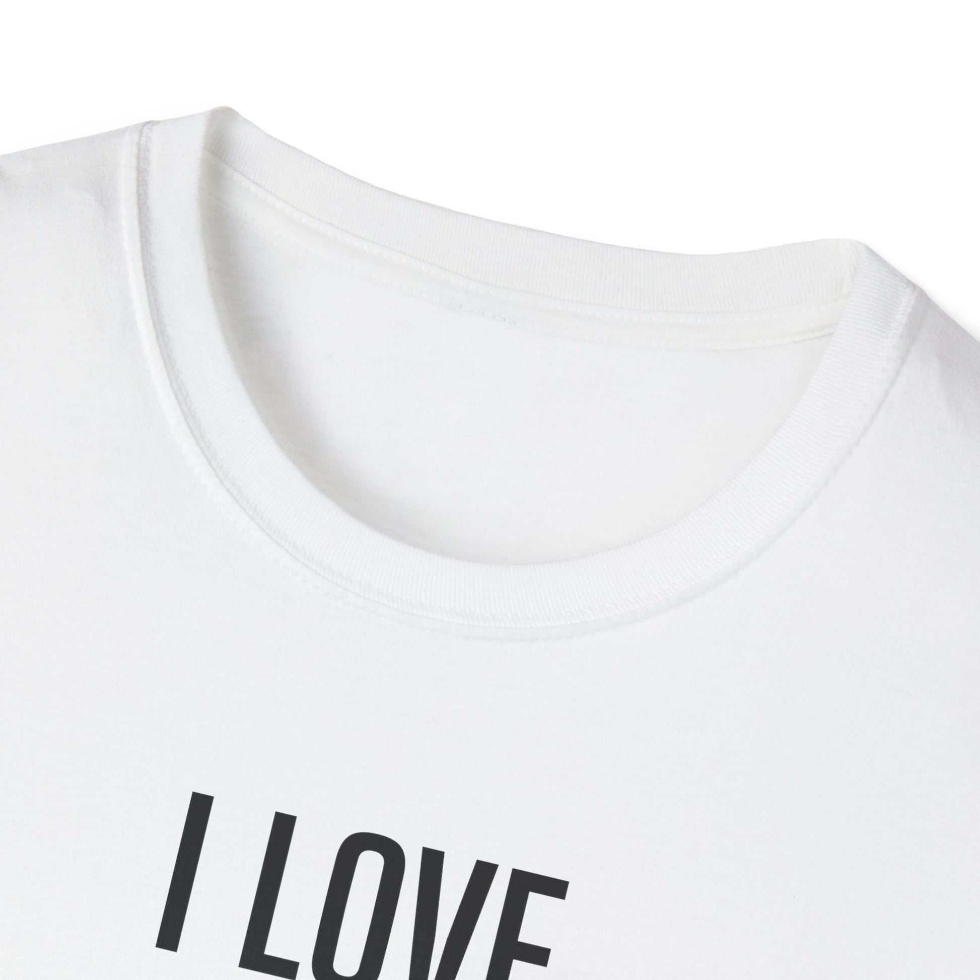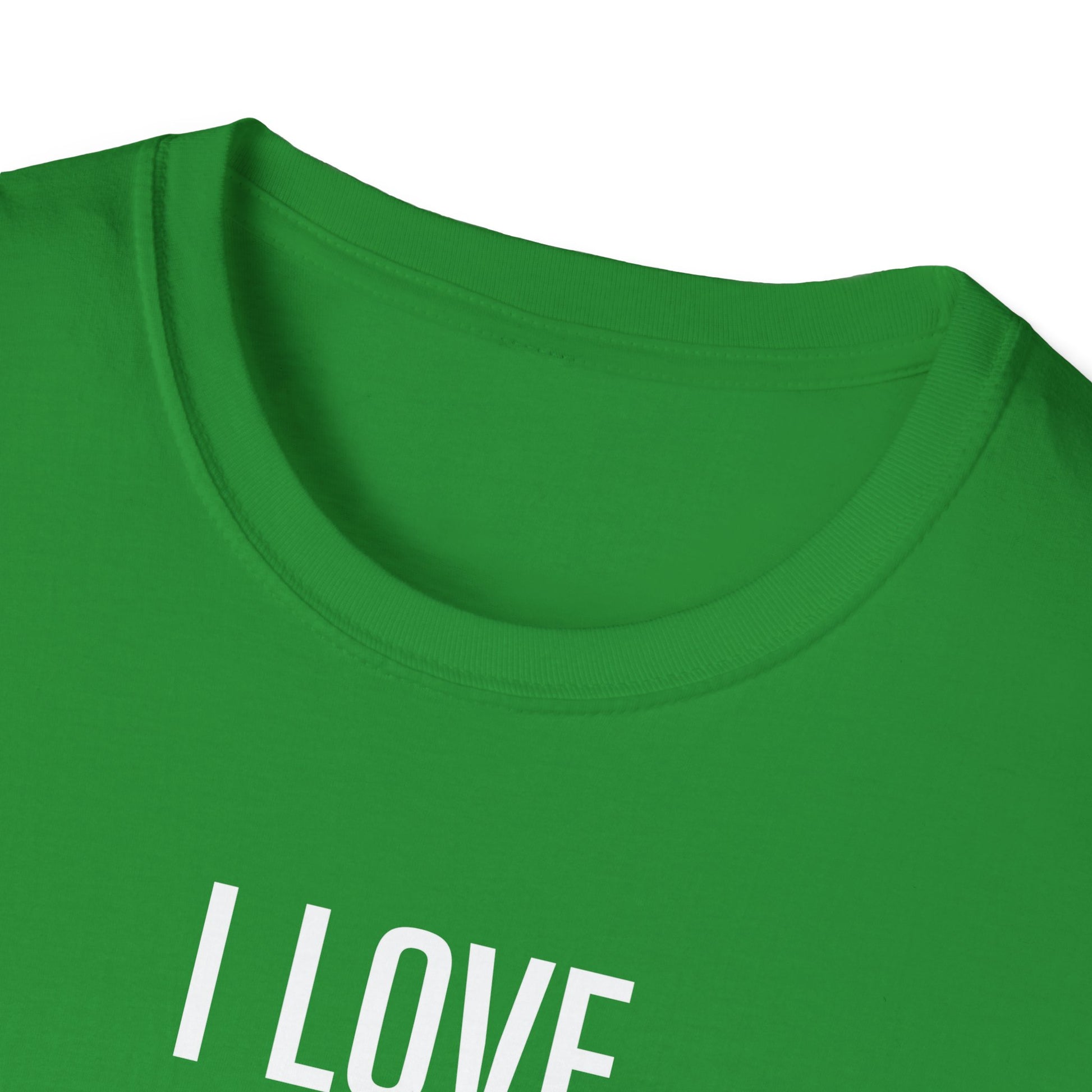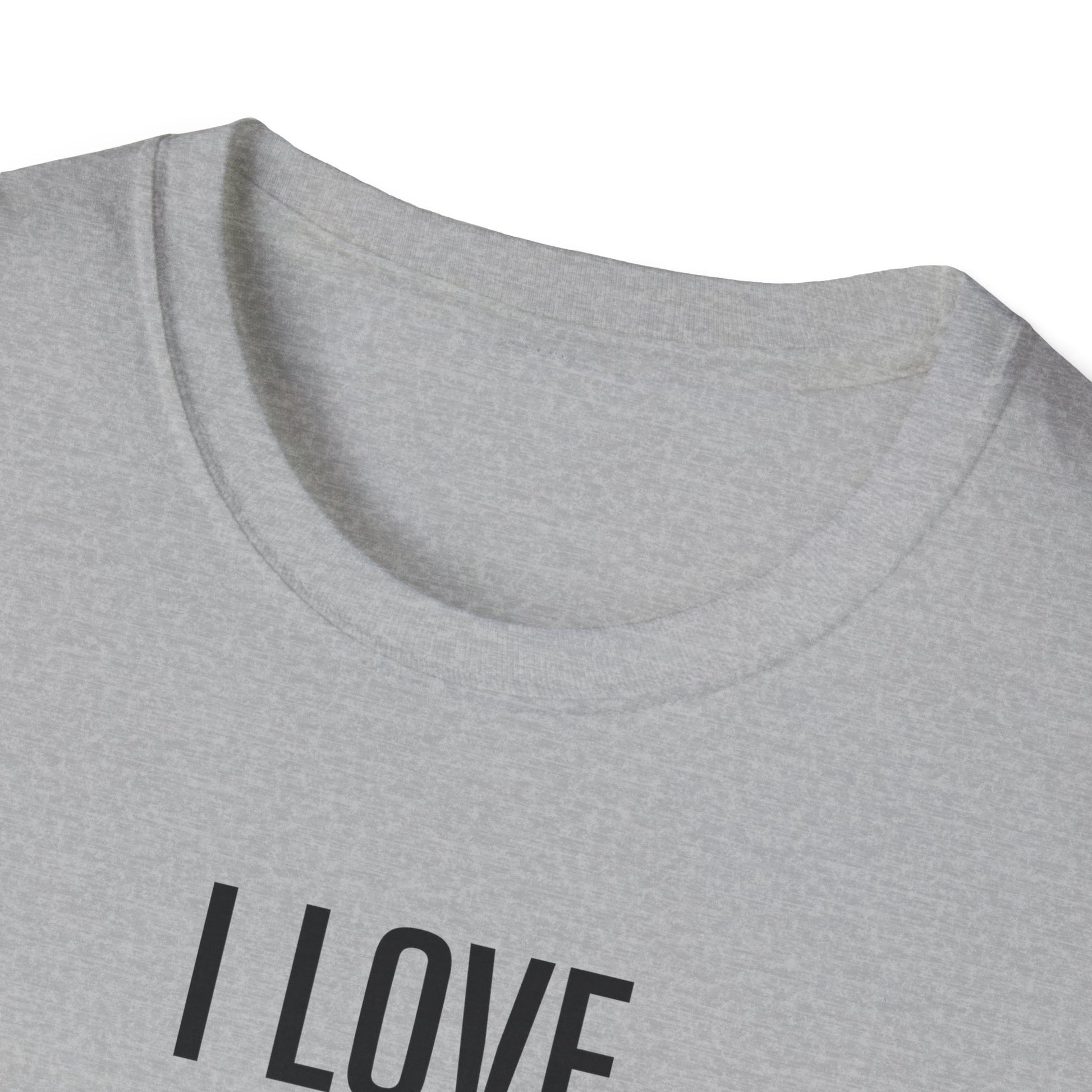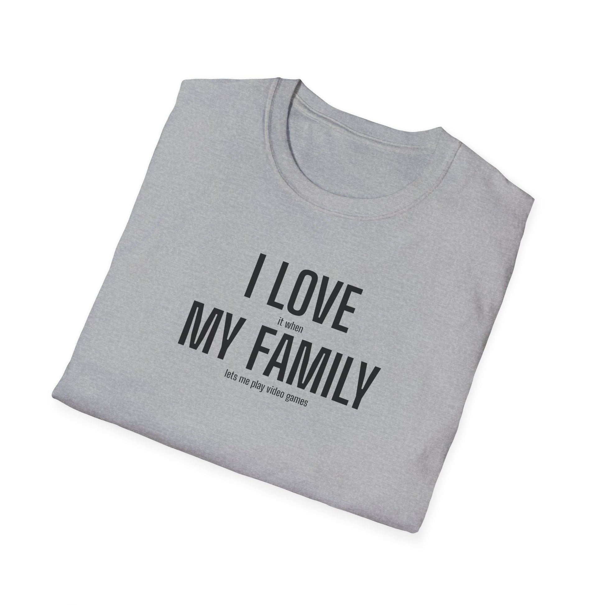 Funny T-Shirt for Gamer Dads with the text 'I LOVE (it when) MY FAMILY (lets me play video games)'. This shirt is a great gift for Father's Day and dads who enjoy playing video games. It gives a casual and humorous vibe, perfect for relaxing at home or hanging out with friends. Target audience includes gamer dads and fathers who appreciate a good laugh. Relevant for Father's Day, birthdays, and casual wear occasions.